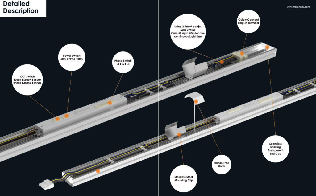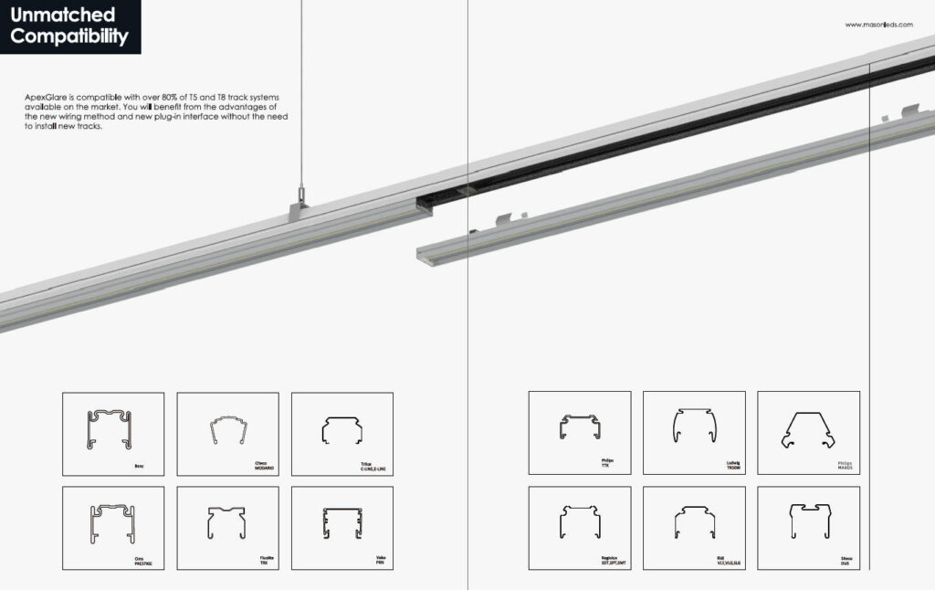 Gêné par le vieillissement des tubes traditionnels et la forte consommation d’énergie ? Vous craignez que remplacer de nouveaux luminaires nécessite de reposer les rails et d’assumer des coûts supplémentaires ? La nouvelle lumière linéaire ApexGlare de Mason est spécialement conçue pour remplacer les tubes traditionnels T5/T8. Compatible avec plus de 80 % des systèmes de rails sur le marché, il permet une amélioration majeure de la qualité de l’éclairage sans modifier les installations existantes — ce qui en fait le choix de premier choix pour l’éclairage dans les espaces commerciaux, les ateliers industriels et les bureaux.