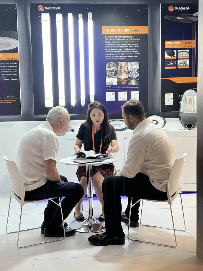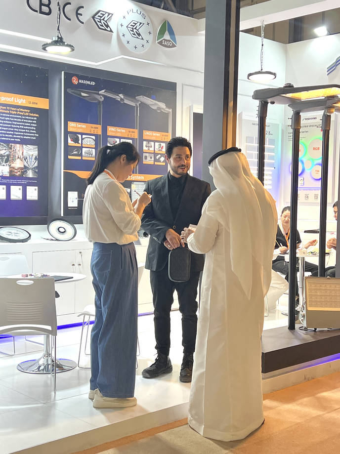 En tant que seule exposition professionnelle d’éclairage actuellement organisée en Arabie Saoudite, cet événement a offert à Masonled une plateforme clé pour s’engager avec le marché local.Répondant aux fortes exigences de l’Arabie saoudite en matière d’accélération des infrastructures, de modernisation industrielle et de projets d’éclairage urbain, Masonled proposait une gamme de produits d’éclairage fonctionnel haute performance, incluant des lampadaires LED, des lampadaires industriels et miniers, des projecteurs triple résistants et des projecteurs.L’entreprise a également mis en avant ses solutions d’éclairage intégrées pour l’éclairage urbain, les paysages touristiques culturels et les sites sportifs.Le stand a attiré de nombreux chefs de projet des collectivités locales, entrepreneurs en ingénierie et distributeurs, ce qui a conduit à des discussions et négociations animées sur place.