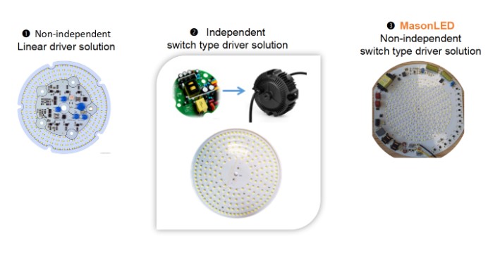 Tính năng | Trình điều khiển chế độ chuyển đổi tích hợp của MasonLED | Trình điều khiển DOB tuyến tính thông thường |